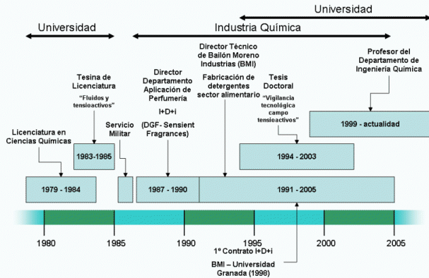 Entre 1979 y 1984 realicé en la Universidad de Granada la Licenciatura en Ciencias Químicas, cursando la especialidad de Química Industrial (el equivalente a la Ingeniería Química actual). En abril de 1985 defendí mi Tesis de Licenciatura. Tras el servicio militar obligatorio, en 1987 me incorporé a la plantilla de Destilaciones García de la Fuente, DGF (actualmente Sensient Fragrances) y a partir de 1991 creé mi propia empresa de fabricación de detergentes: BMI, hasta finales de 2005. He sido también fundador de la empresa de detergentes ecológicos Prodefut, S.L. Desde 1999 formo parte del Departamento de Ingeniería Química de la Universidad de Granada; primero, como profesor asociado a tiempo parcial y tiempo completo alternativamente, luego como ayudante doctor, como profesor permanente colaborador y actualmente como profesor titular de universidad. He formado parte del grupo de investigación Tep 212, «Tensioactivos, Enzimas y Emulsiones» y he colaborado con el grupo de investigación «Evaluación de la Ciencia y de la Comunicación Científica, EC3». Actualmente soy responsable del grupo de investigación Techné, Ingeniería del Conocimiento y del Producto.